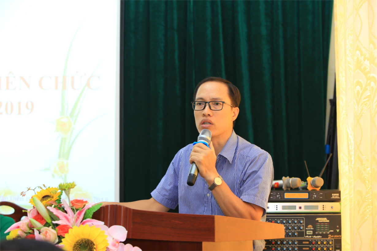 Đồng Chí Hoàng Khắc Hiền – Đại diện Ban thi đua lên báo cáo công tác thi đua năm học 2017 – 2018 và thông qua chỉ tiêu đăng kí thi đua năm học 2018 – 2019.